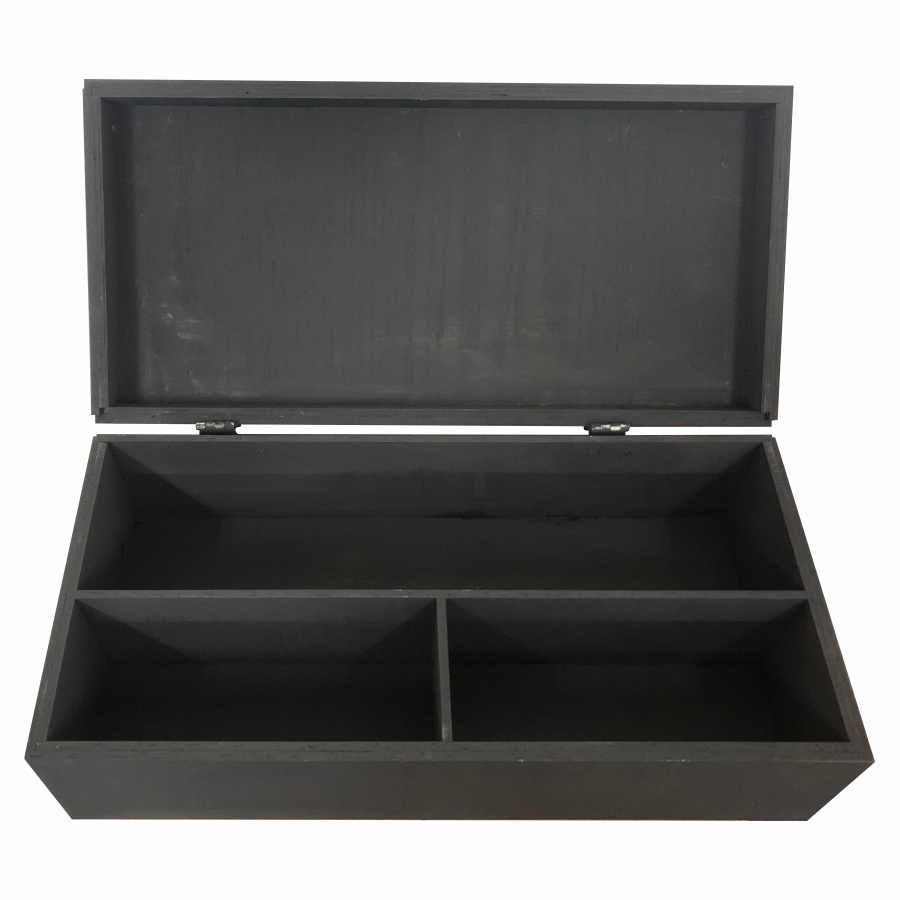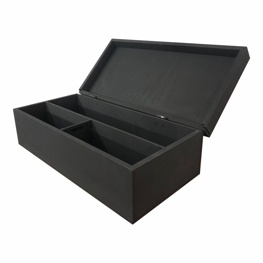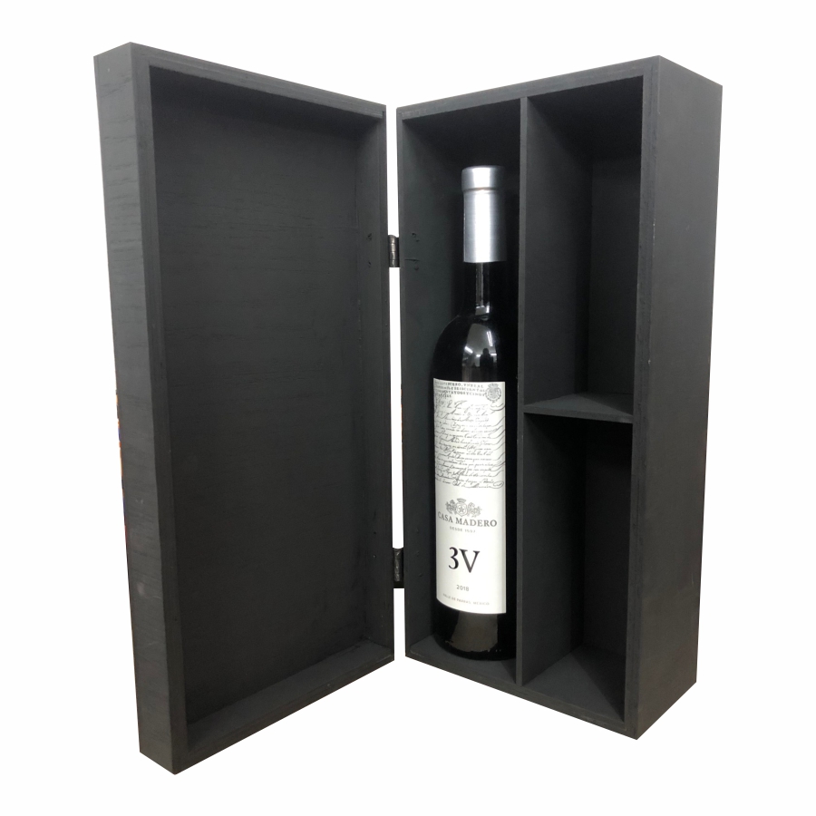 Caja de madera triplay para vino con divisiones internas, bisagras de metal en color plata y broche metálico.